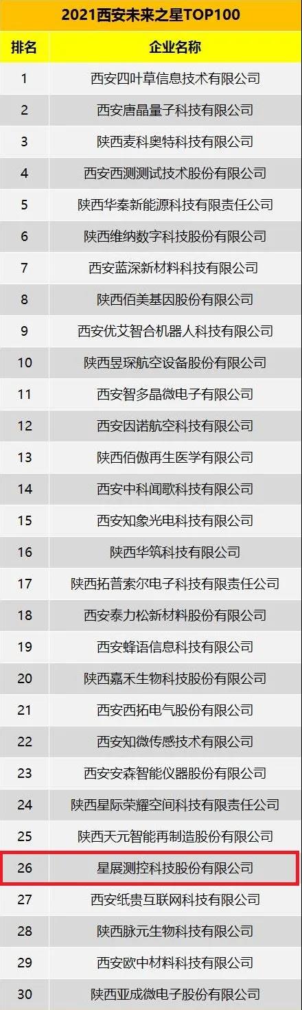 星展测控入选2021“西安未来之星TOP100”